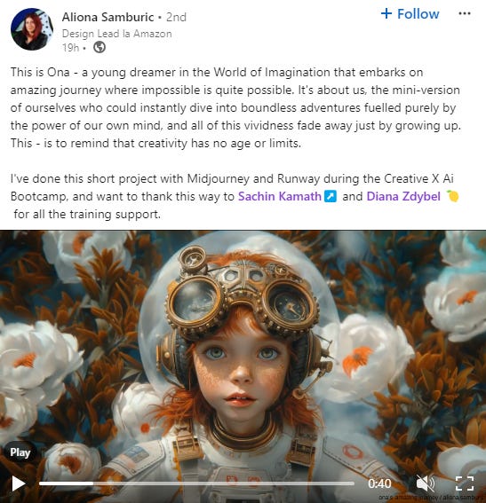 Imagination is the only limit! Aliona created and shared this wonderful work as part of our 2 week bootcamp, and I am sure there will be many more AI-powered creative works to come!